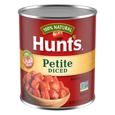 Hunt's flashsteam® tomatoes are peeled with simple hot water. Order online hunt's petite diced tomatoes 28 oz can on www.marketbasketpa.com. Roughly 3.5 servings per container; Greater nyc (ny, nj, ct); Contains 28 oz of diced tomatoes;